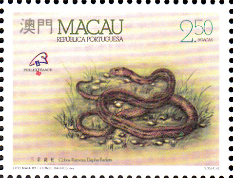 Am 7. Juli 1989 erschien in Macau ein Serie mit vier Marken zur Internationalen Briefmarkenausstellung PHILEXFRANCE ’89 in Paris mit Abbildungen von Schlangen. Hier die erste Marke (MiNr 620), die eine Vorderindische Kobra (Naja naja) zeigt.