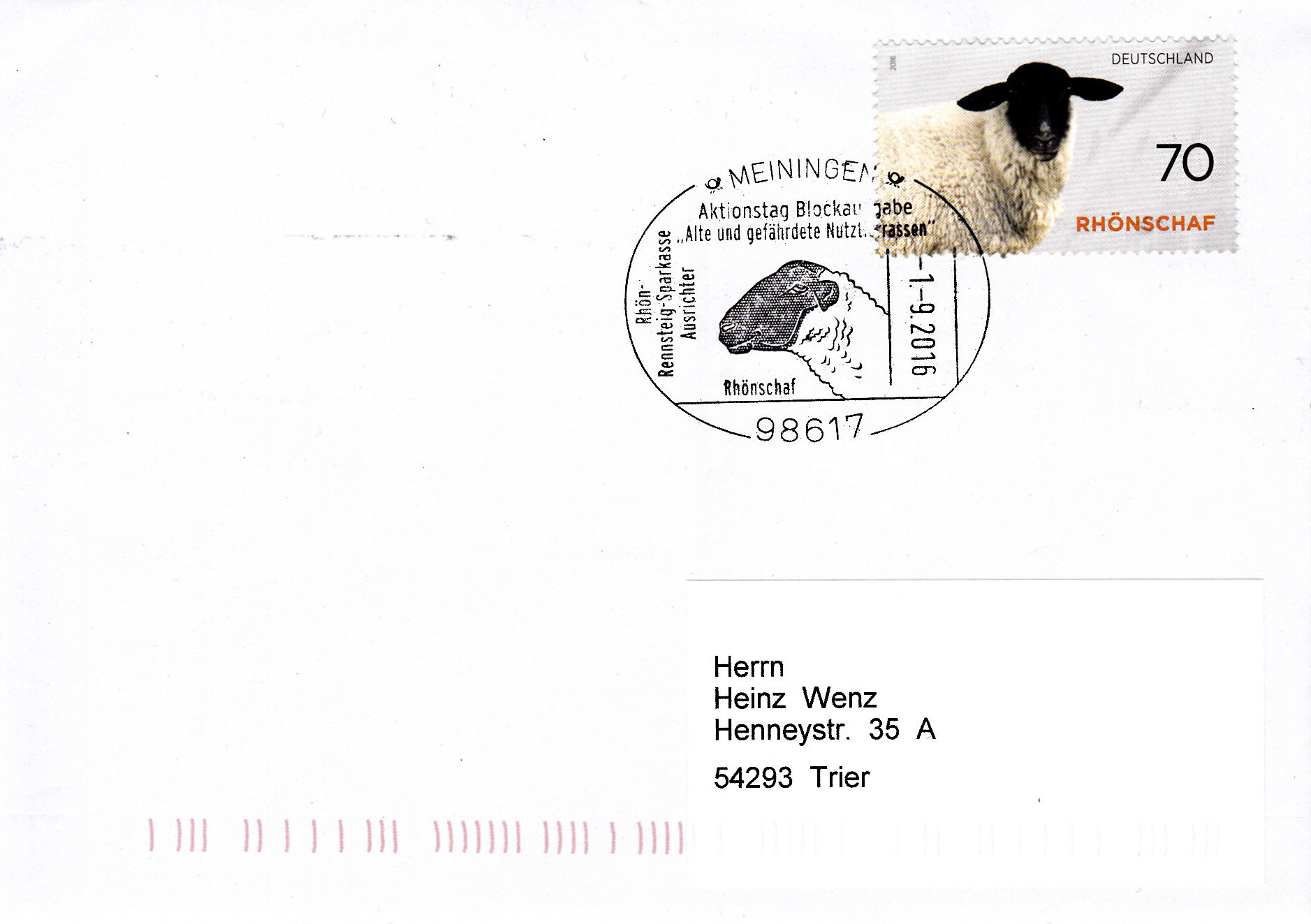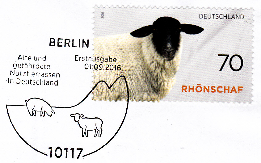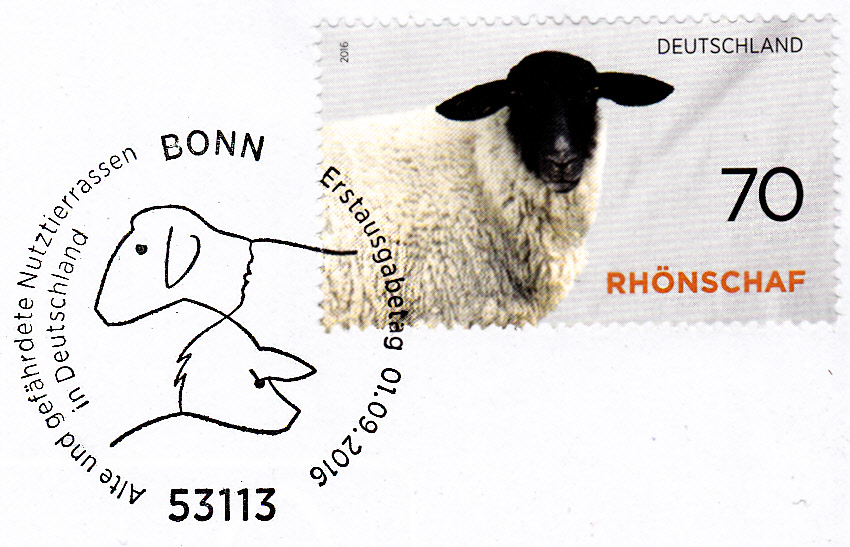 Auf dieser Marke der Deutschen Post AG (MiNr 3261) ist ein Rhönschaf zu sehen.
