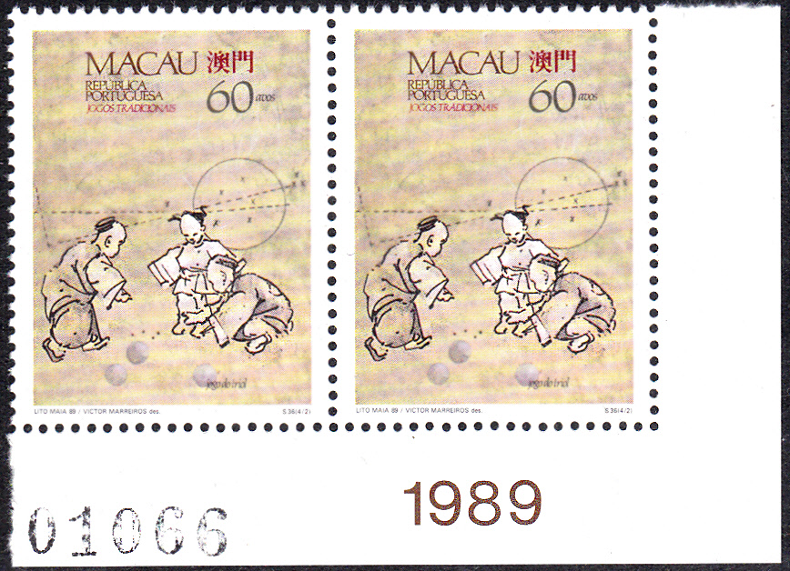 Am 31. Juli 1989 ist in Macau eine Serie mit dem Thema "Traditionelle Spiele" erschienen. Hier die erste Marke (MiNr 624)mit einer Darstellung zum "Jogo do tali" (Jogo = Spiel). Zu diesem Spiel habe ich leider keine Übersetzung des Namens finden können. Nach der Darstellung könnte es sich um eine Art "Kreisel" handeln?