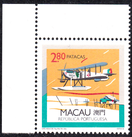 Am 9.10.1989 erschien in Macau eine Serie mit Flugzeugen. Auf der Marke zu 50 Avos (MiNr 628) wird das Amphibien-Flugzeug Piaggio P-136 gezeigt. Hier ein Eckrandstück der Marke.