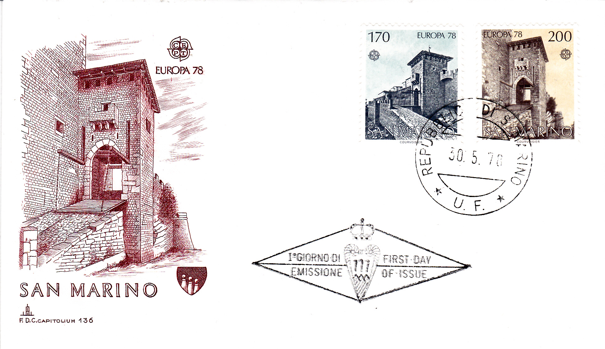 Die gezeigte Marke ist zusammen mit der zweiten Europamarke 1978 aus San Marino auf einem FDC, wie er von der Versandstelle der Post verkauft wurde, verklebt.