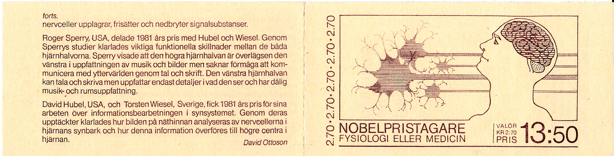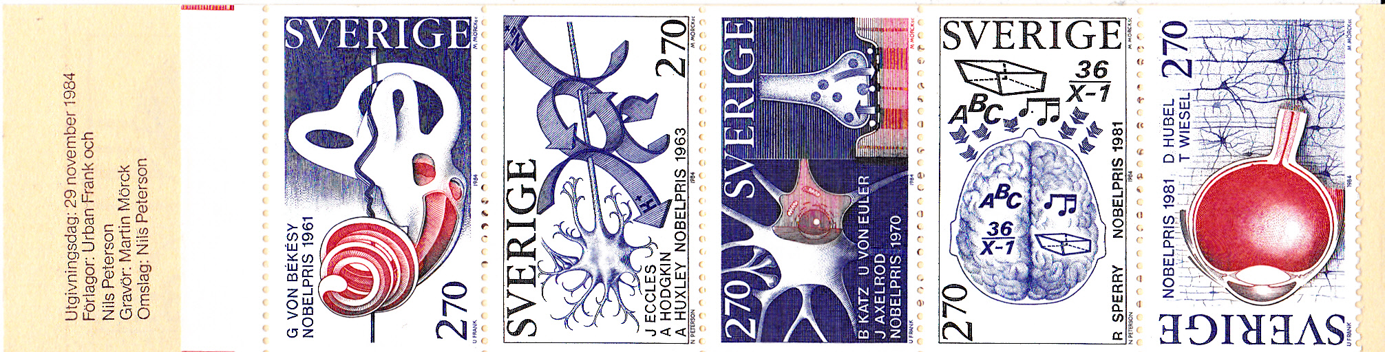 Hier das komplette Heftchen (MiNr MH 103) mit allen fünf Marken zum Thema "Nobelpreisträger für Physiologie und Medizin".