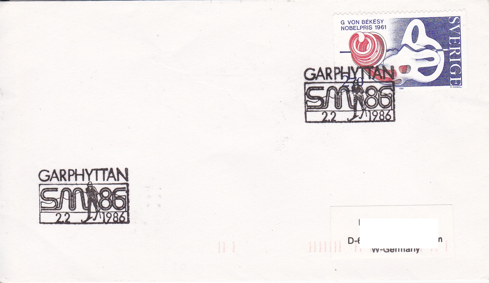 Auf diesem Brief nach Deutschland wurde die Marke für den Nobelpreisträger Georg von Békésy als Porto verwendet und mit einem Sonderstempel in Garphyttan gestempelt.