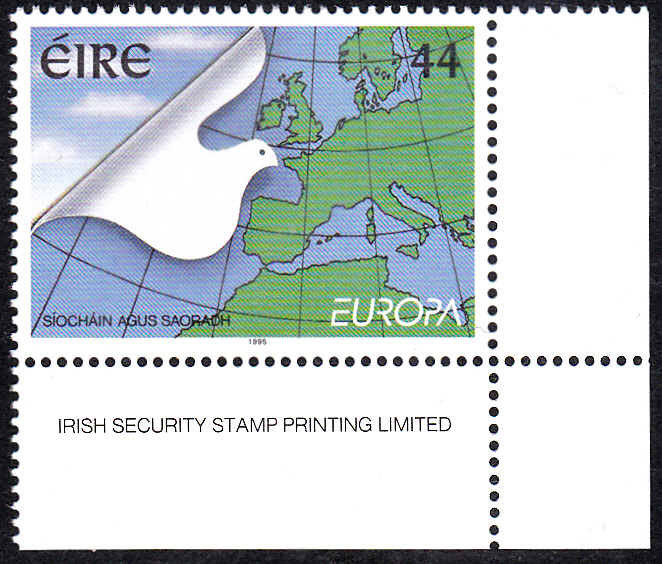 In Irland erschienen die Europamarken 1995 am 6. April 1995 zum Gemeinschaftsthema "Frieden und Freiheit". Hier die Marke zu 44 Pence mit der Abbildung einer Friedenstaube vor der Landkarte von Europa als Eckrandstück mit Druckvermerk. Die Auflage der Marke betrug 750 000 Stück.