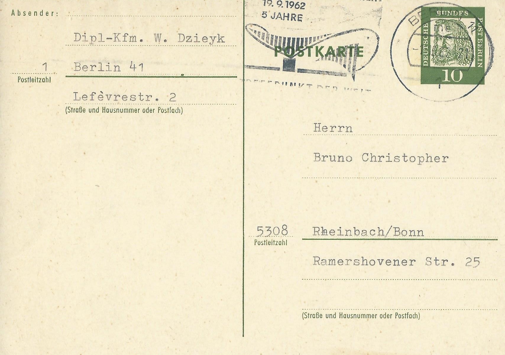 von der Serie Bedeutende Deutsche kann ich hier eine gelaufene Postkarte mit dem Markenmotiv zu 10 Pf „Dürer“ zeigen. Gestempelt wurde sie am 1.12.62 in Berlin 11.