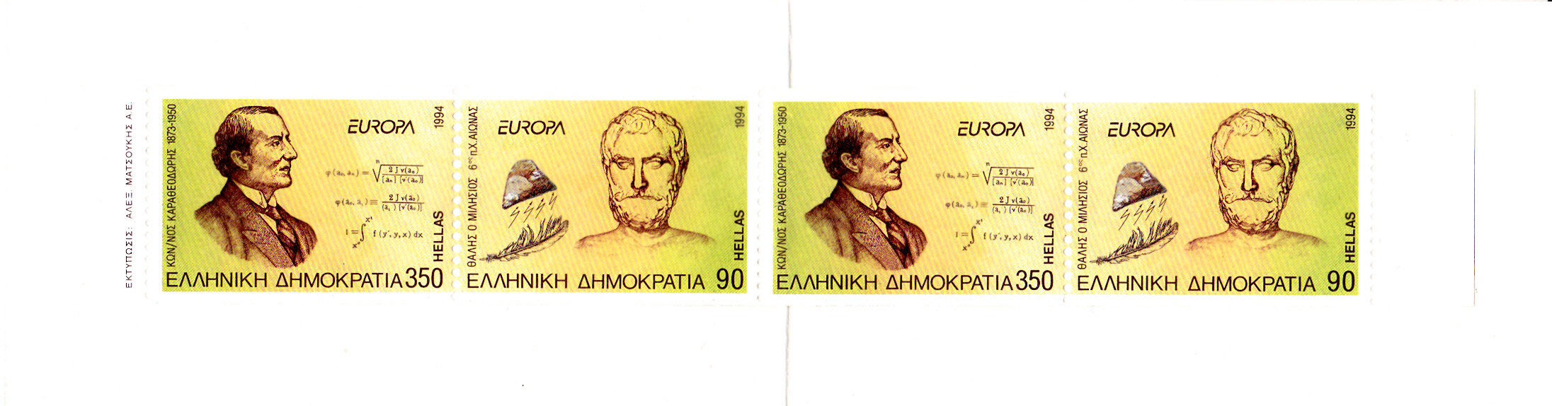 In Griechenland erschienen die Europamarken 1994 am 9. Mai 1994 zum Gemeinschaftsthema "Entdeckungen und Erfindungen". Sie erschienen vierseitig gezähnt in Bögen und nur senkrecht gezähnt in Markenheftchen. Hier die Marke zu 350 Drachmen mit einem Porträt von Thales von Milet (um 625 - 547 v. Chr., Naturphilosoph) und einer Darstellung zur statischen Elektrizität nur senkrecht gezähnt aus einem Markenheftchen (MiNr 1848 C).