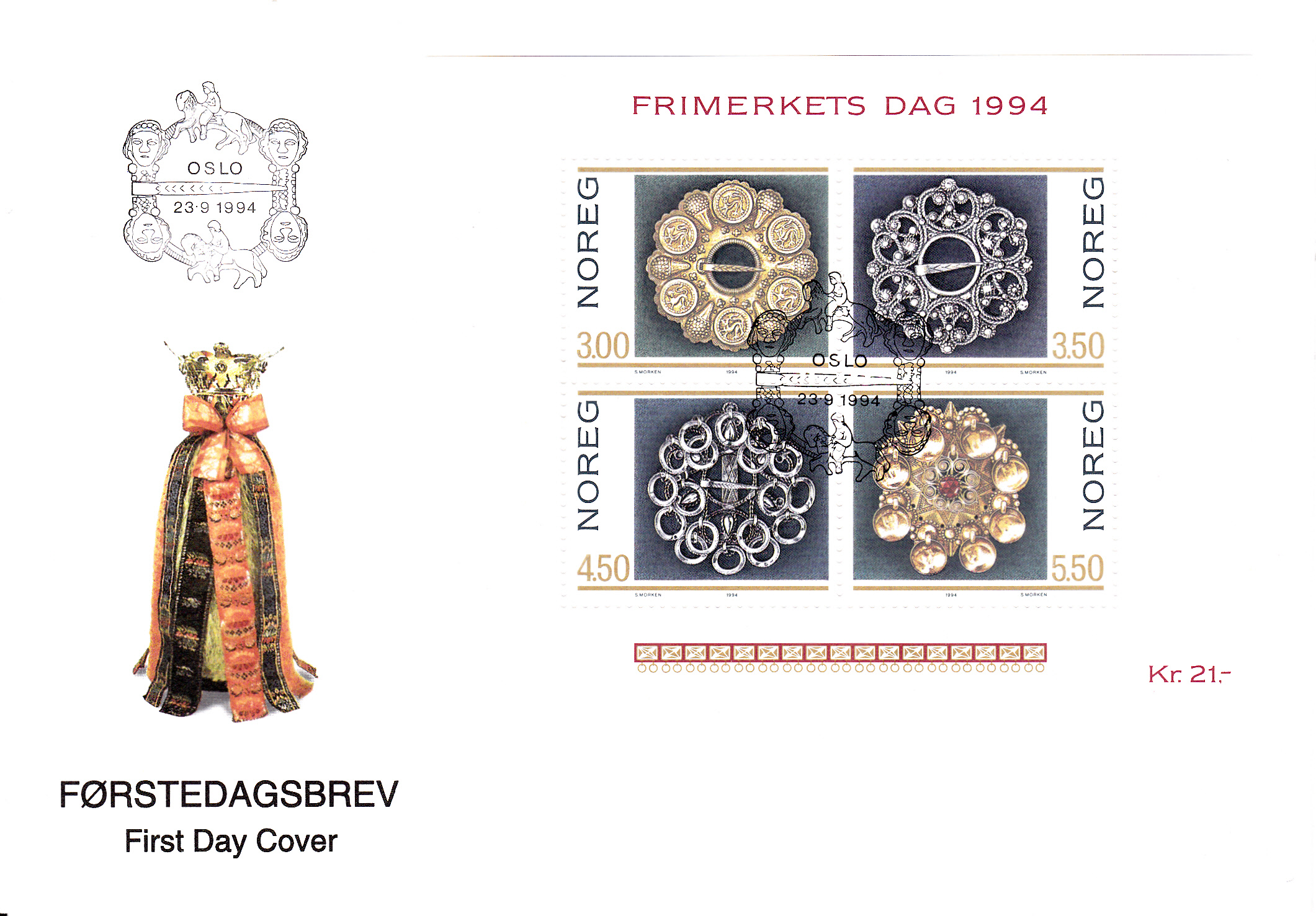In Norwegen erschien am 23.9.1994 ein Block (MiNr Block 21) mit vier Marken (MiNr 1165-1168) zum Tag der Briefmarke 1994. Auf den Marken sind Trachtenbroschen abgebildet.