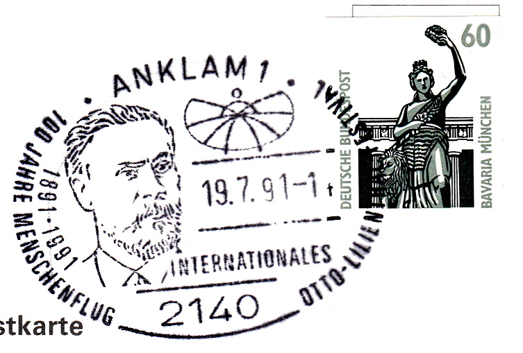 Hier ein Sonderstempel vom 19.7.1991 aus Anklam zum Internationalen Otto-Lilienthal Festival aus Anlass "100 Jahre Menschenflug" mit einem Porträt von Lilienthal im Stempelbild.
