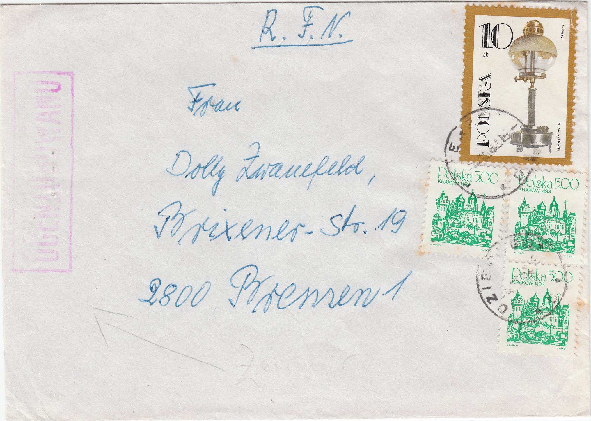 Hier als Beispiel ein solcher Brief von Polen nach Deutschland, aufgegeben am 14.01.1982: