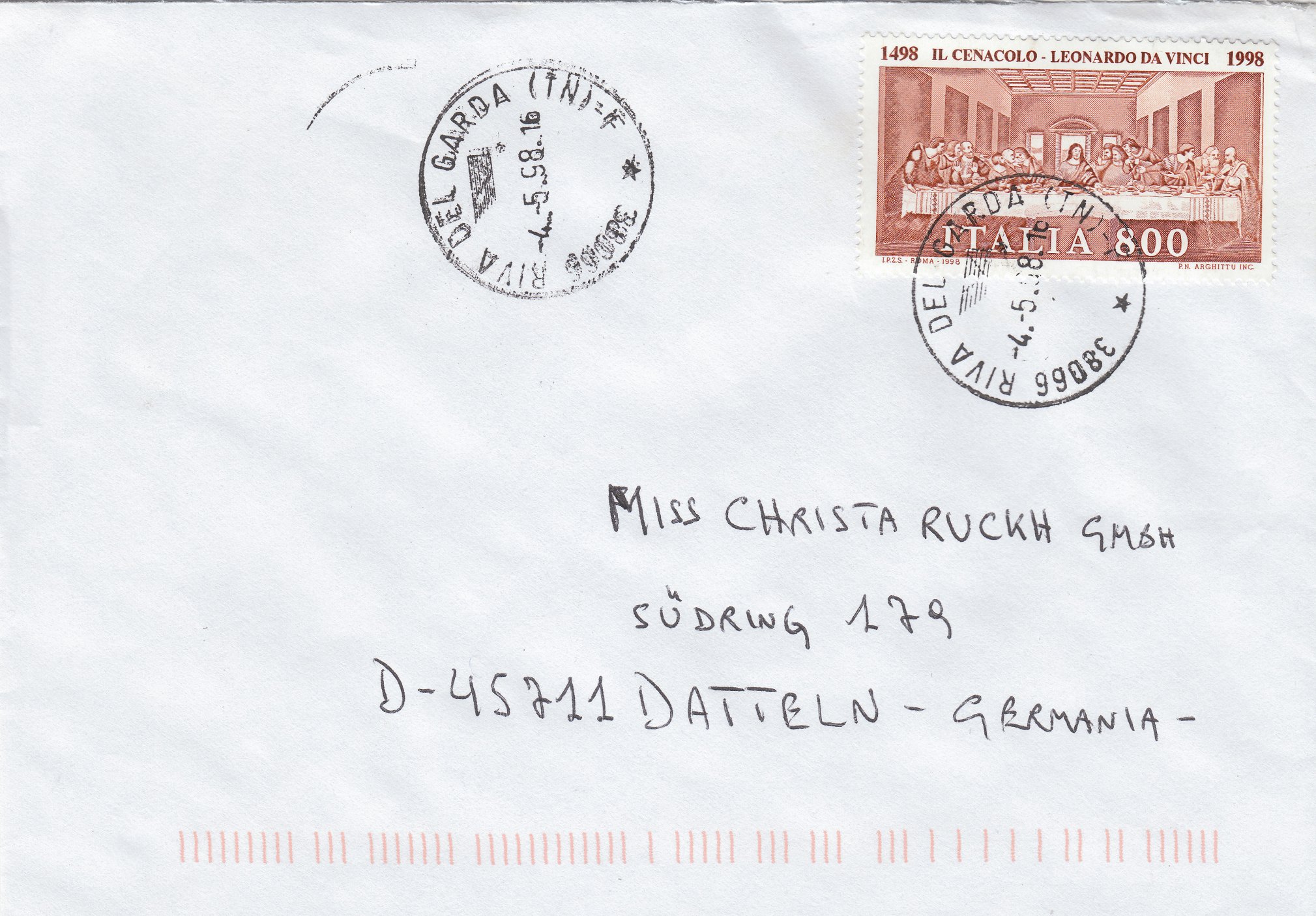 Die Briefmarke auf diesem Brief aus Italien erschien 1998 zum 500. Jahrestag der Fertigstellung des Gemäldes:
