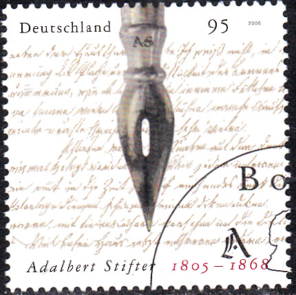 Auf dieser Marke zum 200. Geburtstag von Adalbert Stifter der Deutschen Post AG (MiNr 2490) wird eine stählerne Schreibfeder im Markenbild abgebildet.