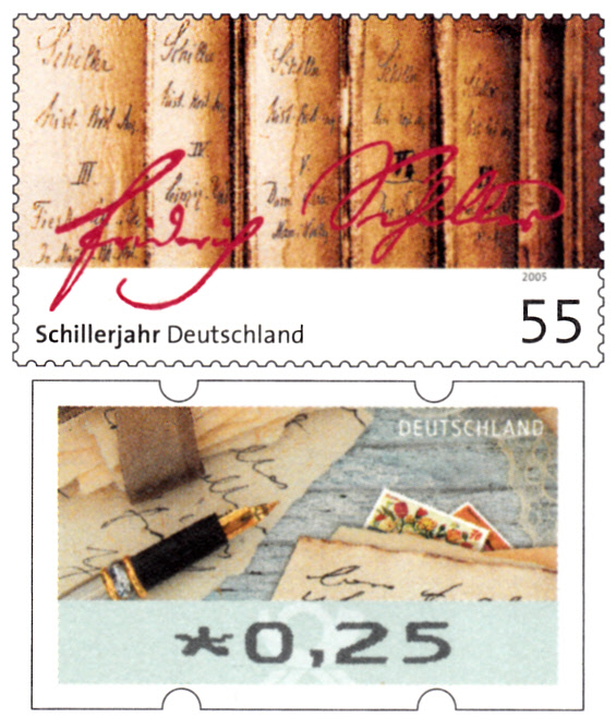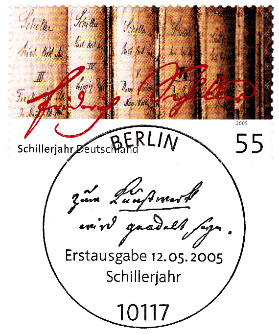 Die bereits gezeigte Sondermarke (MiNr 2461) der Deutschen Post zum 200. Todestag von Friedrich von Schiller ist hier mit dem Ersttagsonderstempel Berlin entwertet.