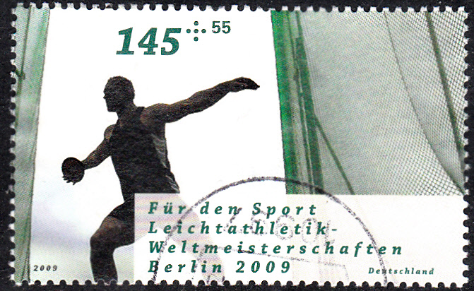 Diese Marke aus Ungarn (MiNr 2262 A) mit der Abbildung eines Diskuswerfers ist zur 8. Europäische Leichtathletik-Meisterschaften in Budapest erschienen.