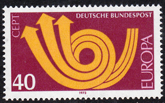 Bei der Deutschen Bundespost erschienen die Europamarken 1973 am 30. April 1973. Hier eine postfrische Marke zu 40 Pfennig mit dem Gemeinschaftsmotiv "Stilisiertes Posthorn ", die in einer Auflage von 73 450 000 Stück erschien.