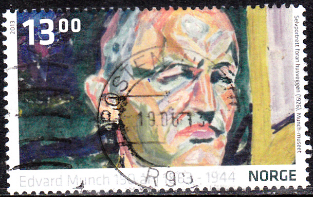 Zum 150. Geburtstag von Edvard Munch erschien in Norwegen diese Marke (MiNr 1804) in einer Briefmarkenserie. Sie zeigt sein Werk "Selbstporträt vor der Hauswand" aus dem Jahre 1926.