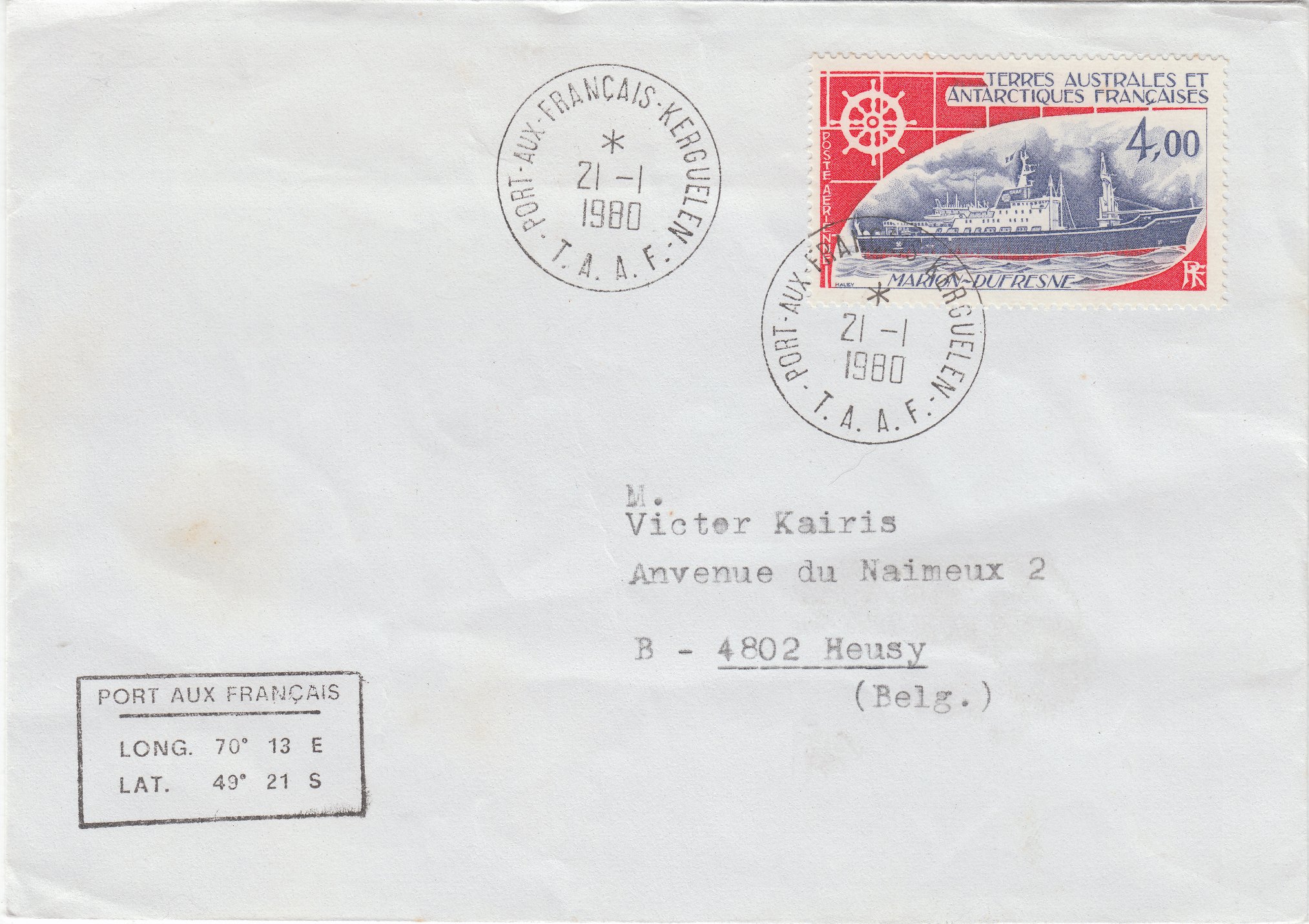 Dieser Beleg dokumentiert, dass das Forschungsschiff MARION DUFRESNE 1 am 21.01.1980 die Forschungsstation Port-aux-Français mit der geographischen Lage 49° 21’ Süd, 70° 13’ Ost versorgte: