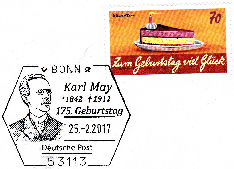 Der bereits gezeigte Sonderstempel vom 25.2.2017 aus Bonn zum 175.Geburtstag von Karl May passt natürlich besser auf den Ganzsachenumschlag zu seinem Geburtstag.