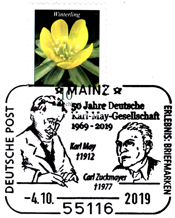 Im Sonderstempel aus Mainz vom 4.10.2019 zum Jubiläum "50 Jahre Deutsche Karl-May-Gesellschaft wird auch ein Porträt von Karl May gezeigt.