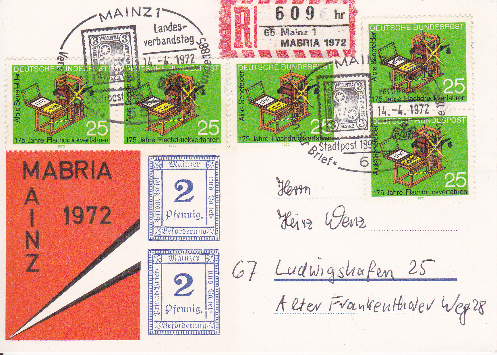 Auf dieser Postkarte per Einschreiben sind portogerecht fünf Marken "175 Jahre Flachdruckverfahren" verkebt. Das Porto betrug für die Postkarte 25Pf und die Zusatzleistung Einschreiben 100Pf, zusammen aslo 125Pf. Die Postkarte wurde am Ersttag der Marke mit einem Sonderstempel in Mainz abgestempelt und mit einem Sonder-R-Zettel zur Briefmarkenausstellung MABRIA 1972 beklebt.