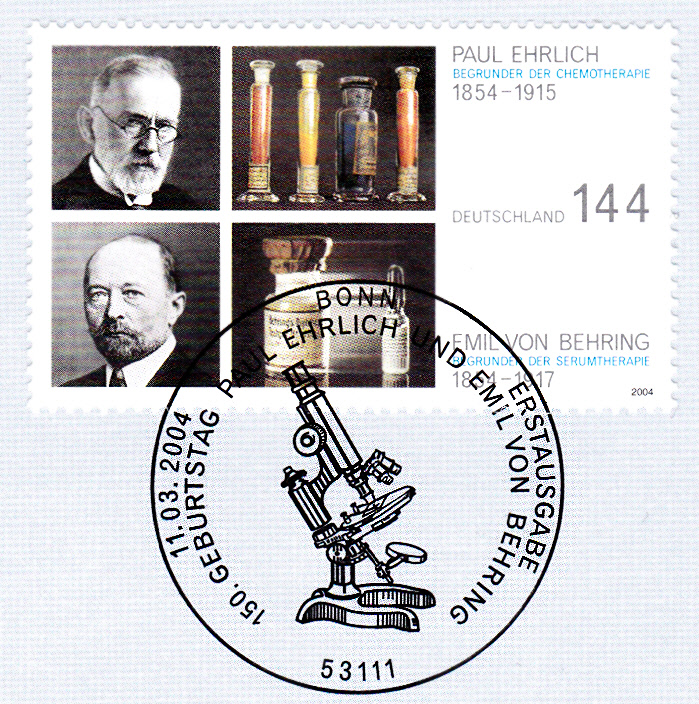 Hier wurde die bereits gezeigte Marke der Deutschen Post AG zum 150. Geburtstage von Emil von Behring und Paul Ehrlich mit dem Ersttagsonderstempel aus Bonn gestempelt.