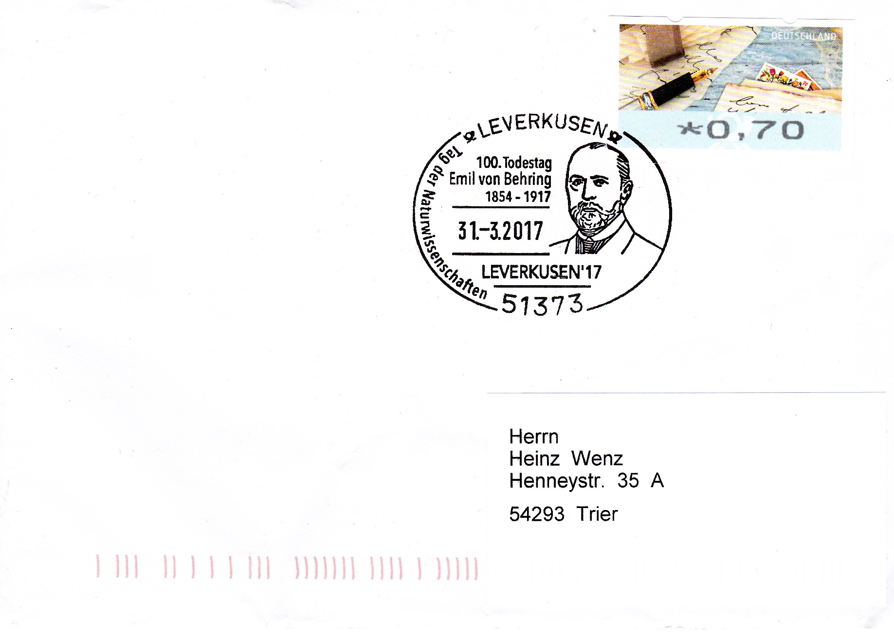 Sonderstempel vom 31.3.2017 aus Leverkusen zur Briefmarkenausstellung Leverkusen'17 und zur Erinnerung an den 100. Todestag von Emil von Behring. Im Stempelbild wird ein Porträt von ihm gezeigt.