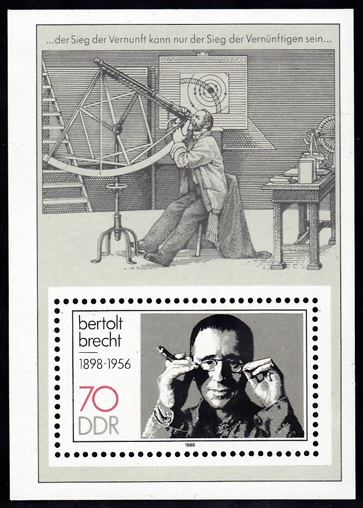 In der DDR gab es zum 90. Geburtstag von Bertolt Brecht eine Blockausgabe (MiNr Block 91), Im Markenbild der Blockausgabe ist ein Porträt von Berthold zu finden und auf dem Blockrand eine Szene seines Theaterstückes "Leben des Galilei".