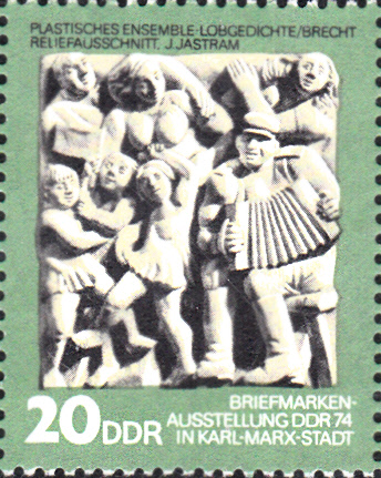 Auf dieser Marke wird ein Reliefausschnitt eines Reliefs von Martin Wetzel (1929 - 2008) zu den Lobgedichten von Brecht gezeigt. Auch den Titel dieses Reliefs konnte ich nicht ausfindig machen.