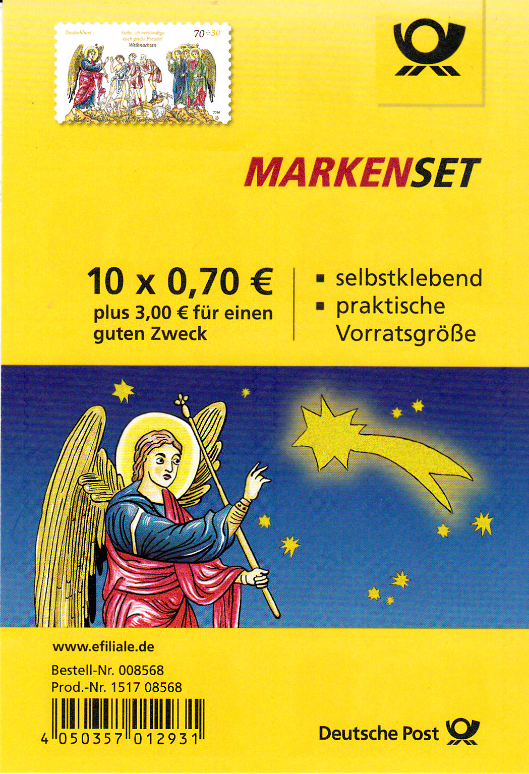 Die Weihnachtsmarke 2016 gibt es auch als selbstklebende Marke (MiNr 3268)in einem sogenannten Markenset (MiNr Folienblatt 60).