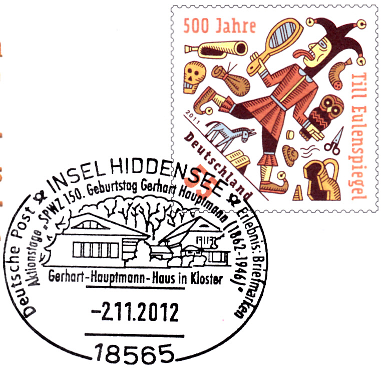 Auf zwei Marken der Freimarkenserie von 1948 der Sowjetischen Besatzungszone MiNr 213 (6Pf) und MiNr 223 (40Pf) ist ein Porträt von Gerhart Hauptmann zu sehen. Die beiden Werte gibt es auch noch mit anderem Wasserzeichen aus der DDR (MiNr. 328 und MiNr 336) aus dem dem Jahre 1952.