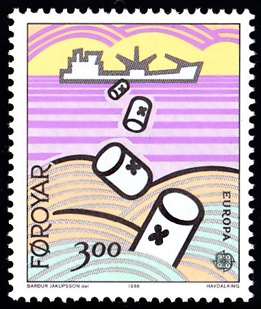 In Dänemark Färöer erschienen die Europamarken 1986 am 7. April 1986 zum Gemeinschaftsthema "Natur- und Umweltschutz". Die Marken der Färöer zeigen Motive zur Meeresverschmutzung Hier die Marke zu 3,00 Kronen mit der Abbildung "Entsorgung von Giftmüll". Die Auflage dieser Marke betrug 1 325 000 Stück.