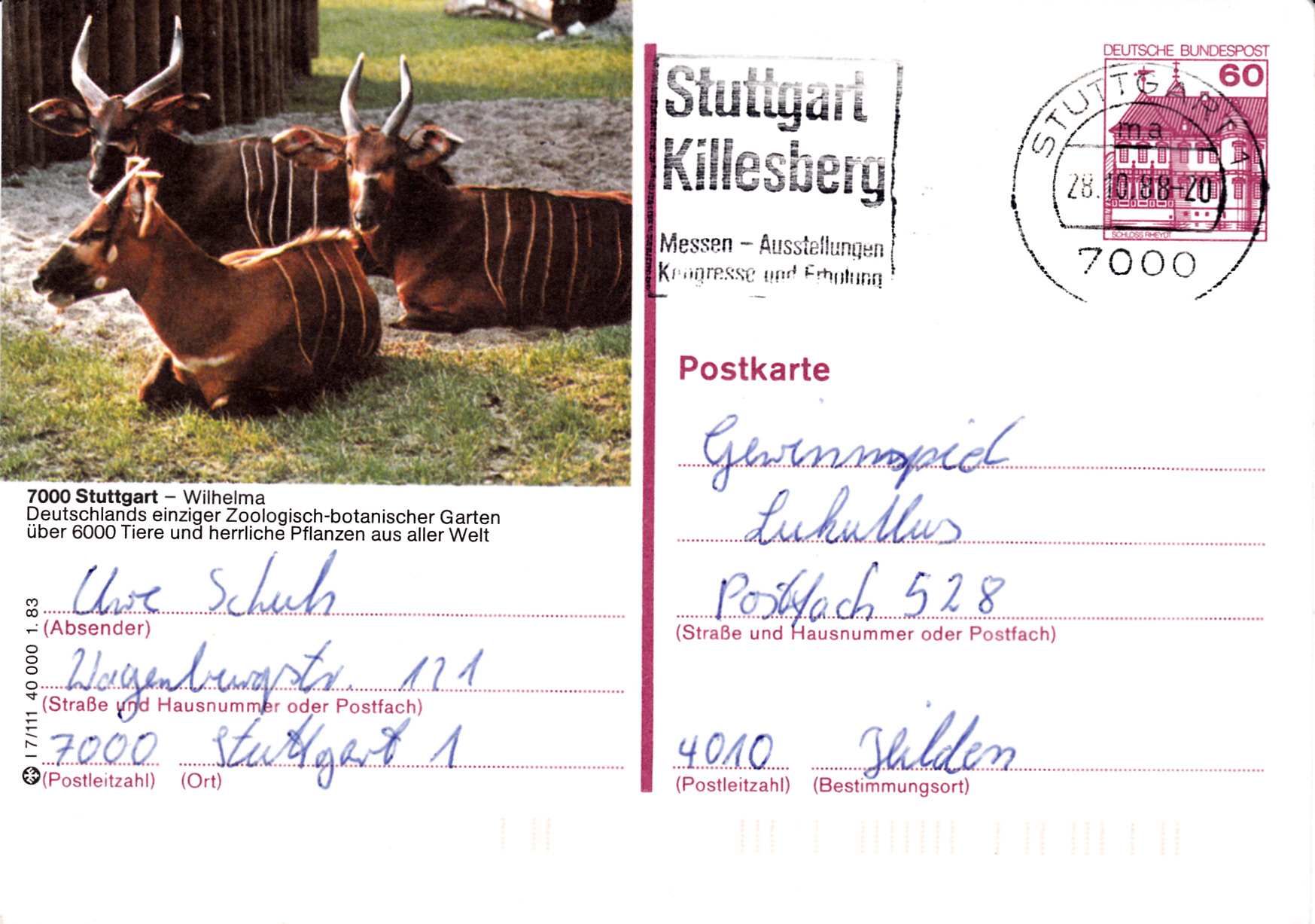 Der bereits gezeigte Maschinenwerbestempel "Wilhelma ein Erlebnis" jetzt aber mit den Kennbuchstaben "mh" anstatt "mk" mit dem Stempeldatum 1.3.1978.