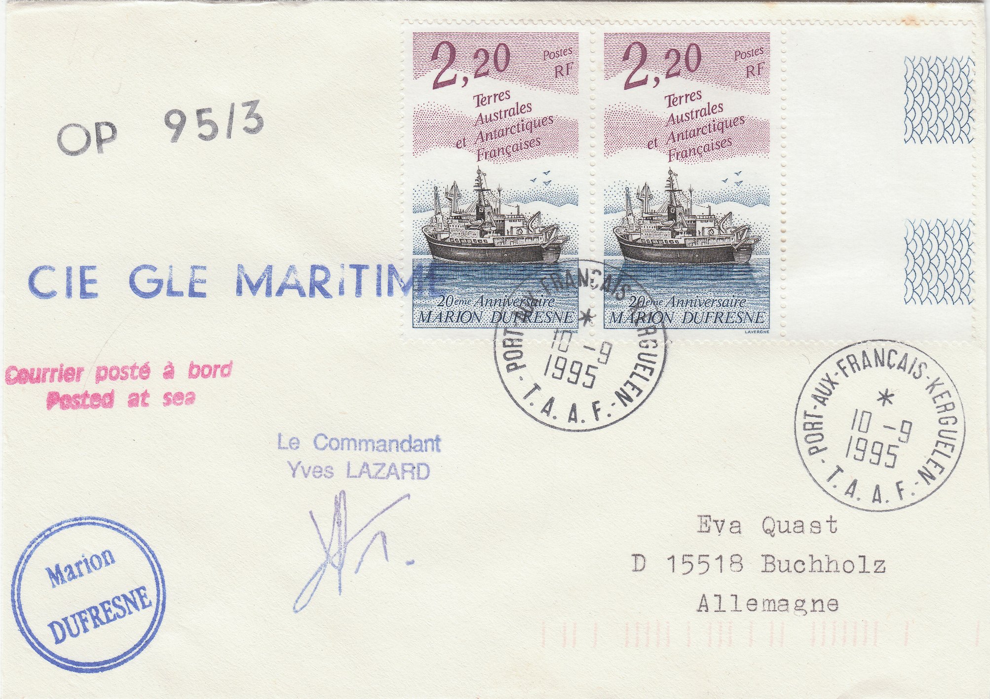 Als Frankatur diente ein Paar der Sondermarke zum 20. Jubiläum der MARION DUFRESNE 1.