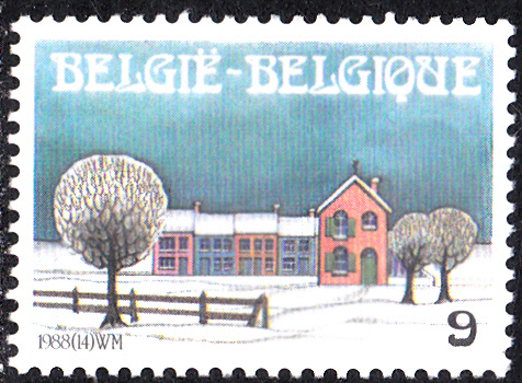 Auf der Marke aus Belgien zu "Weihnachten und Neujahr" (MiNr 2359) wird eine Winterlandschaft gezeigt.