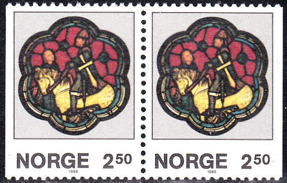 Die Weihnachtsmarken 1986 aus Norwegen zeigen Glasmalereien von Gabriel Kielland (1871-1960, Maler, Architekt und Glasmaler). Die Marken sind im Markenheftchen erschienen. Hier ein Paar 2,10 Kronen (MiNr 958 Dl/958 Dr) mit der Abbildung der Glasmalerei "Olaf Kyrre stiftet das Bistum Nidaros".