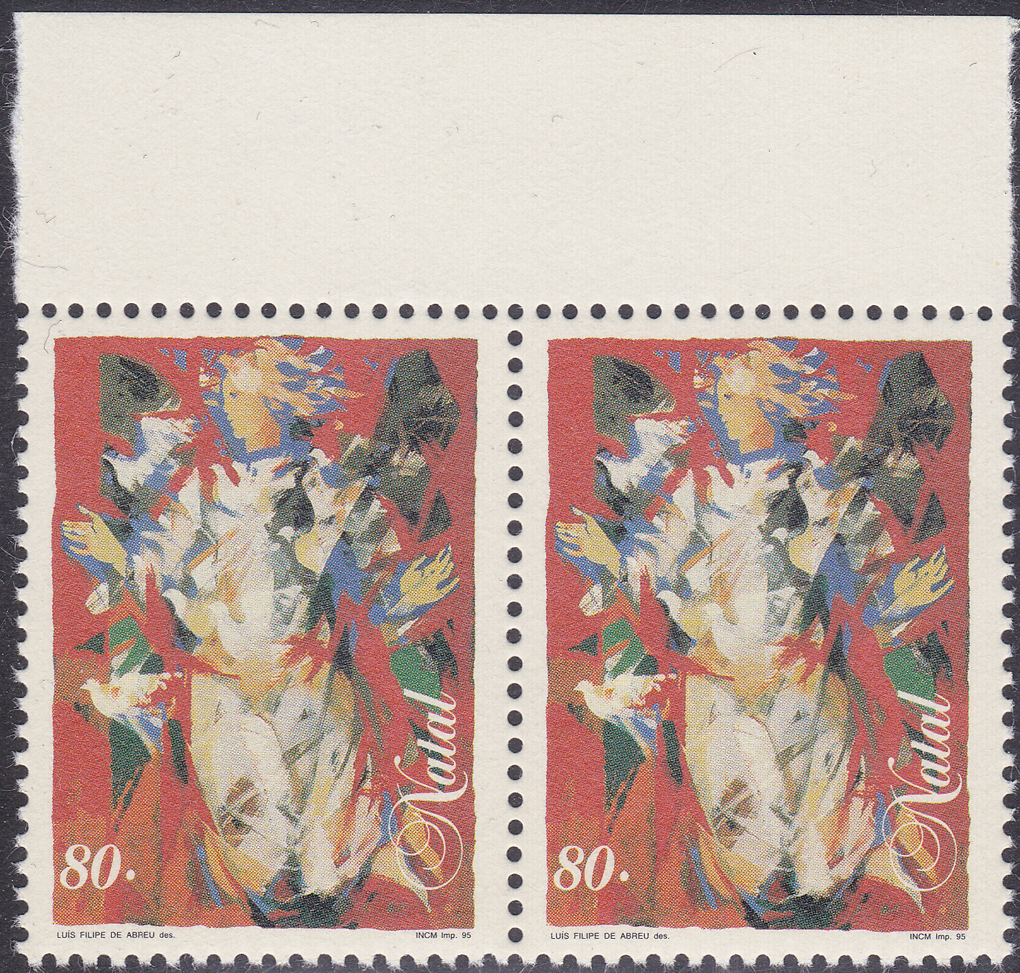 In Portugal ist 1995 diese Weihnachtsmarke mit einem Verkündigungsengel erschienen. Hier ein Paar vom Bogenrand. Diese Marke (MiNr 2109 II) ist ohne Landesname.