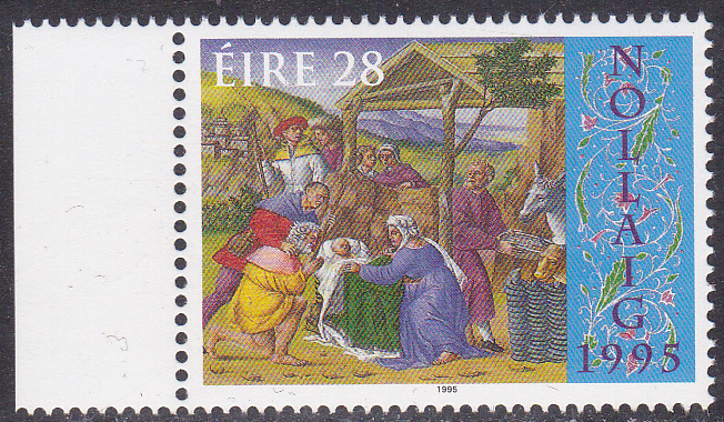 Auf der vierten und letzten der Weihnachtsmarken 1995 aus Irland (MINr 925) die Miniatur zu Christi Geburt.