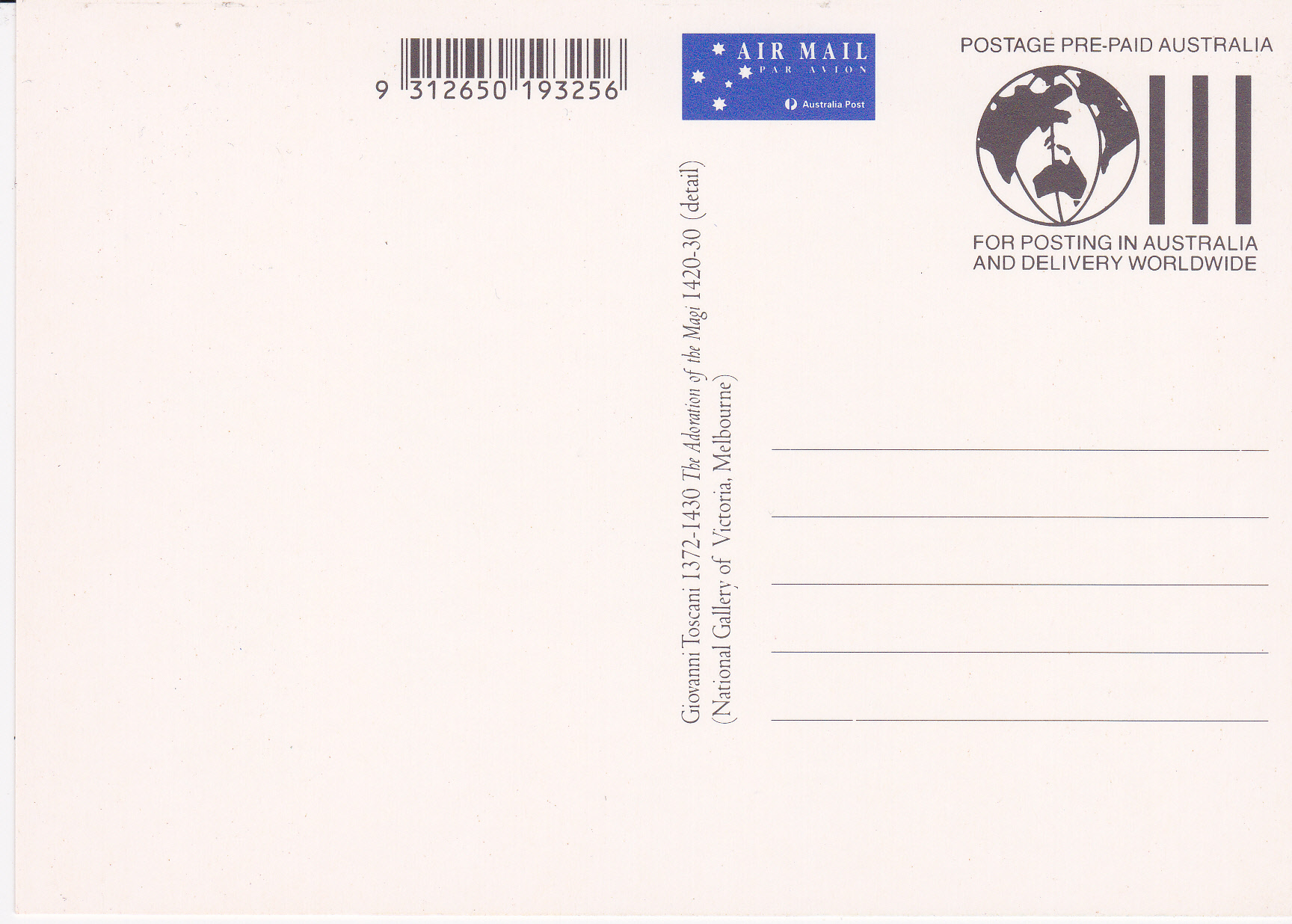 Hier zeige ich die Ganzsache mit der Weihnachtsmarke zu 40 Cent (MiNr 1435 A). Auf der Marke wird ein Detail aus dem Gemälde "Anbetung der Heiligen Drei Könige" von Giovanni Toscani (1372-1430), italienischer Maler gezeigt.