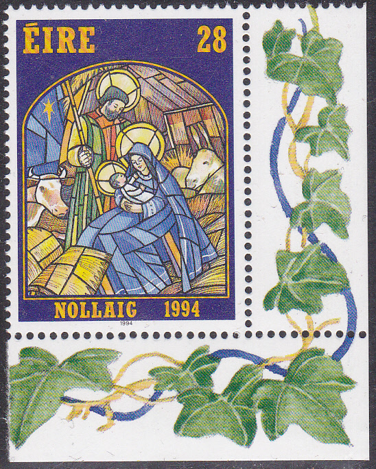 In Irland ist auch 1994 eine Serie mit vier Weihnachtsmarken erschienen. Hier eine Marke zu 28 Pence (MiNr 878) mit der Abbildung "Christi Geburt§ nach einem Buntglasfenster von Pamela Leonhard.