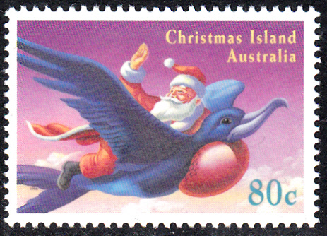 Auch 1995 erschienen auf der Weihnachtsinsel Weihnachtsmarken. Das Ausgabedatum war bereits der 14. September. Hier die Marke zu 40 Cent mit dem Motiv "Weihnachtsmann auf Fregattvogel fliegt zur Weihnachts-Insel".