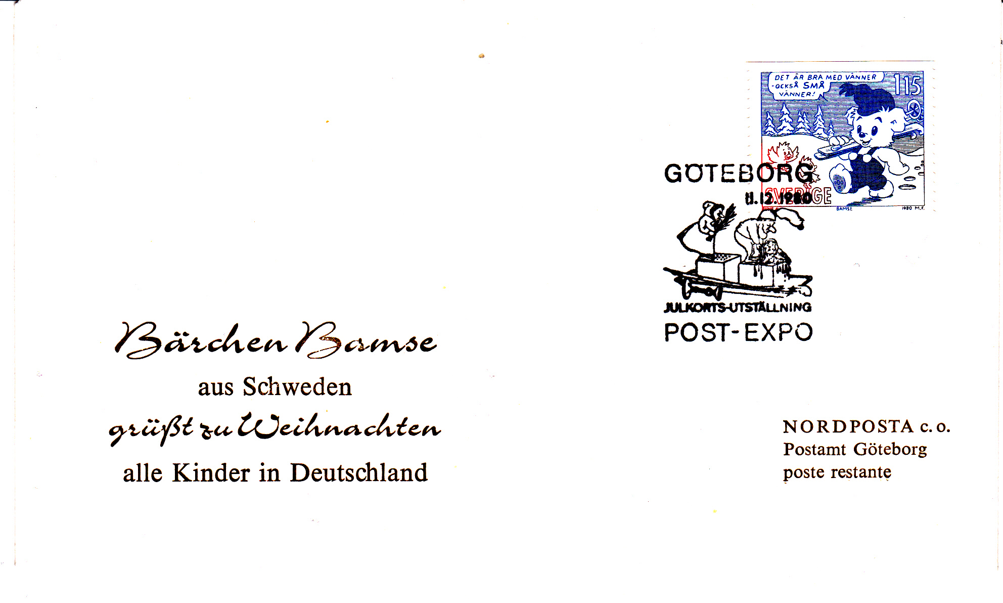 Dieser Sonderstempel vom 11.12.1980 aus Göteborg (Schweden) macht auf eine Weihnachtskarten-Ausstellung (Julkorts-Utställning) aufmerksam.
