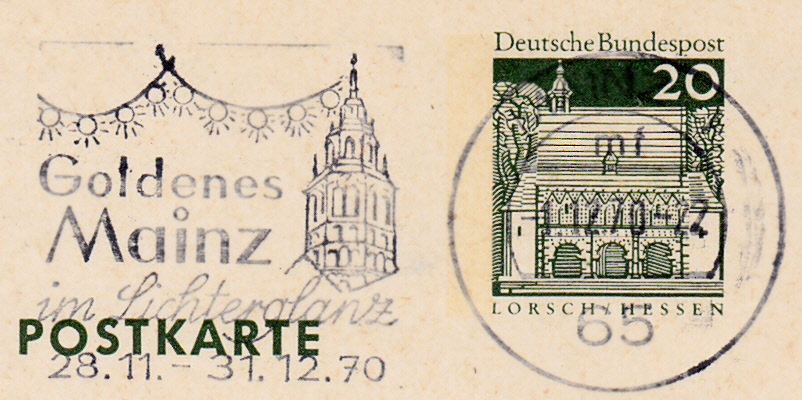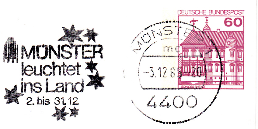 Hier nun ein weiterer Maschinenwerbestempel aus Münster vom 3.12.1985, der mit dem Text "Münster leuchtet ins Land 2. bis 31.12." auf die weihnachtliche Beleuchtung in Münster aufmerksam macht.