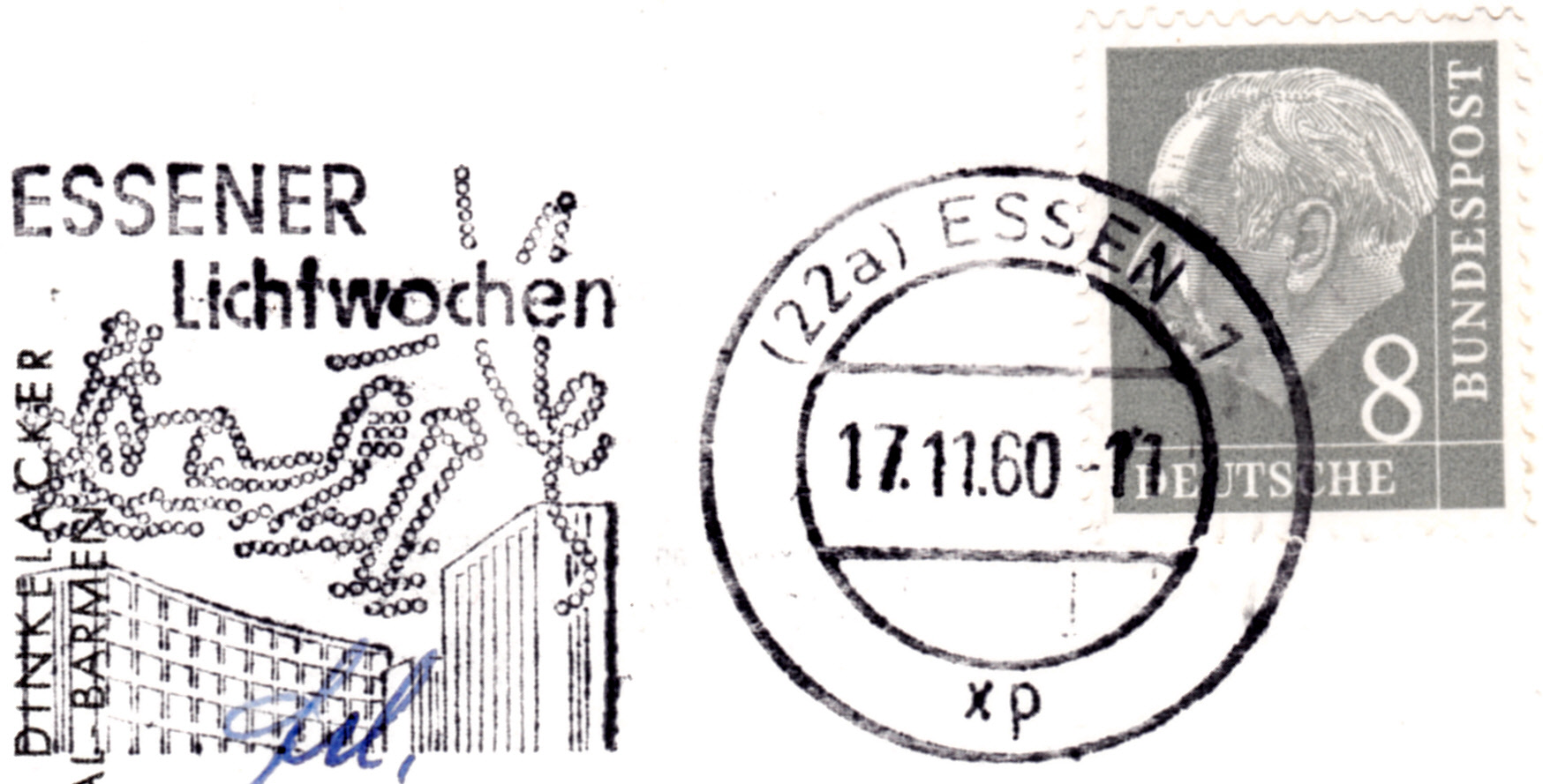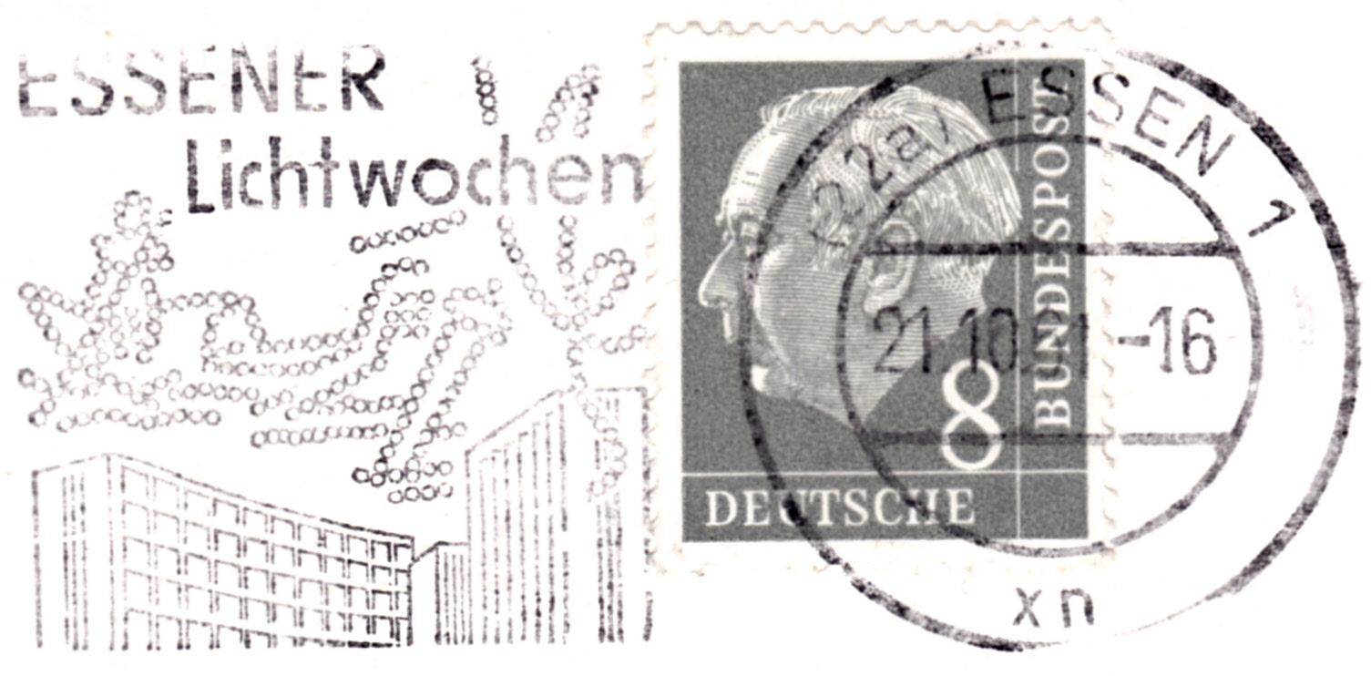 Hier kommt eine Ergänzung zu dem bereits gezeigten Maschinenwerbestempel "Essener Lichtwochen" mit dem Stempelkopf "43 Essen 1". Diese Postkarte wurde am 17.11.1960 gestempelt. Der Stempelkopf "(22a) Essen 1" hat die Kennbuchstaben "xp".