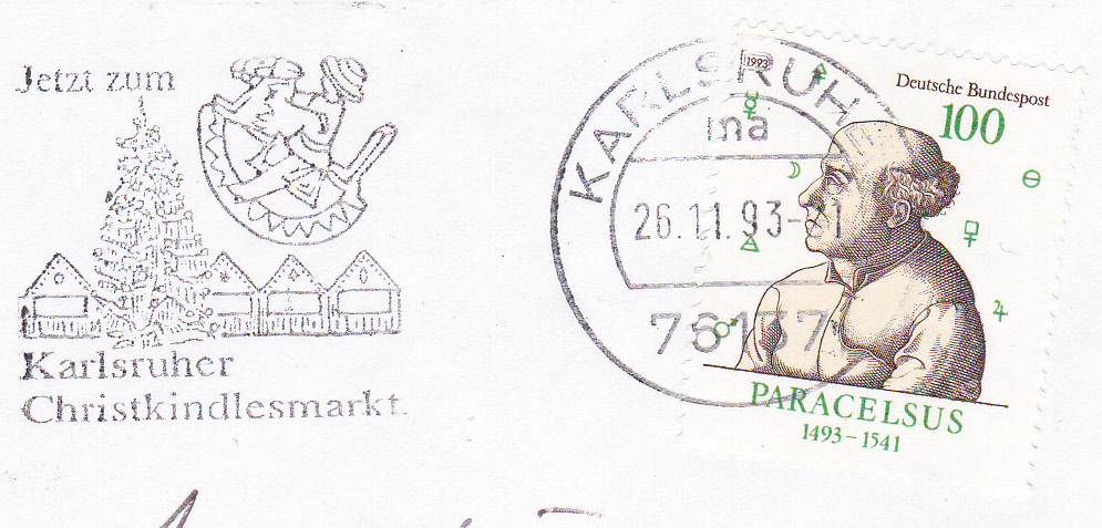 Sonderstempel vom 11.12.1993 aus Rodach zur "Fränkischen Weihnacht" 1993. Im Stempelbild werden das Rathaus und die Stadtpfarrkirche St. Johannis abgebildet.