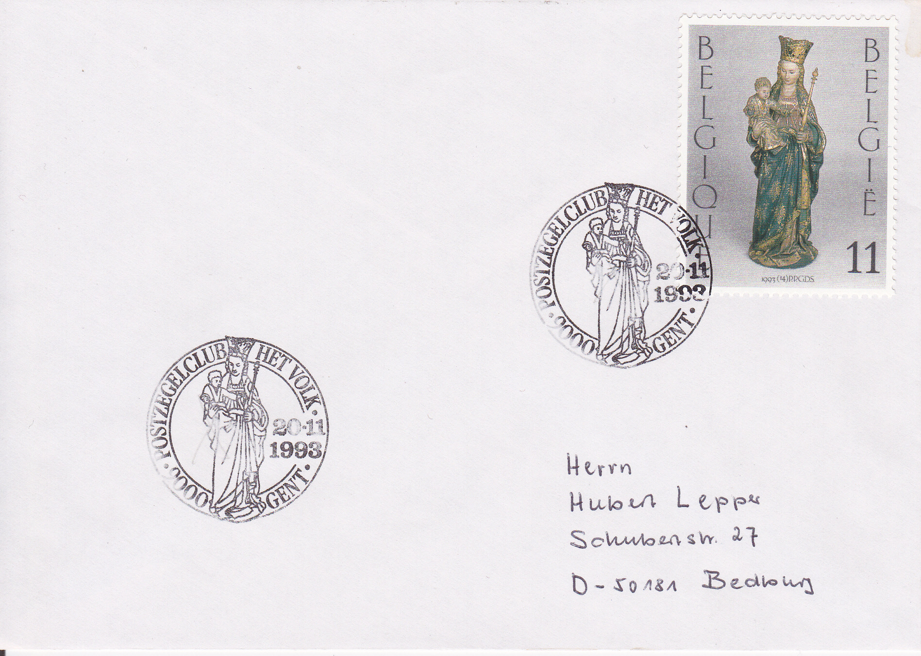 Diese 1993 in Belgien erschienene Marke "Weihnachten und Neujahr" (MiNr 2582) zeigt Maria mit Kind nach einer Skulptur aus der Kirche Notre-Dame de la Chapelle in Brüssel. Die Marke wurde auf diesem Brief am 20.11.1993 in Gent mit einem Sonderstempel gestempelt, der im Stempelbild die gleiche Darstellung hat.