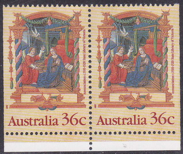 Die Marke zu 36 Cent zeigt eine Illustration zu "Mariä Verkündigung". Hier eine vierseitig gezähnte Marke (MiNr 1177 A) aus dem Bogen.