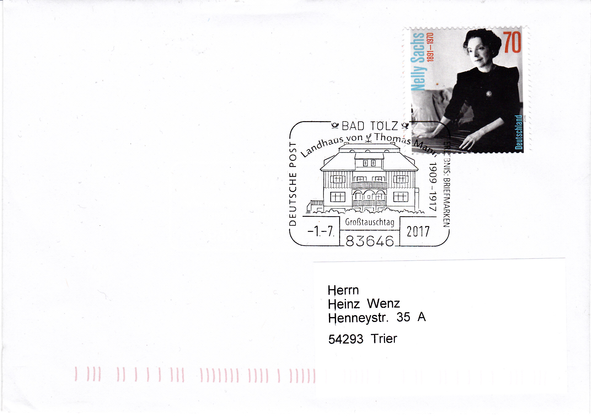 Sonderstempel aus Bad Tölz vom 1.7.2017 mit der Abbildung dieses Landhauses von Thomas Mann.
