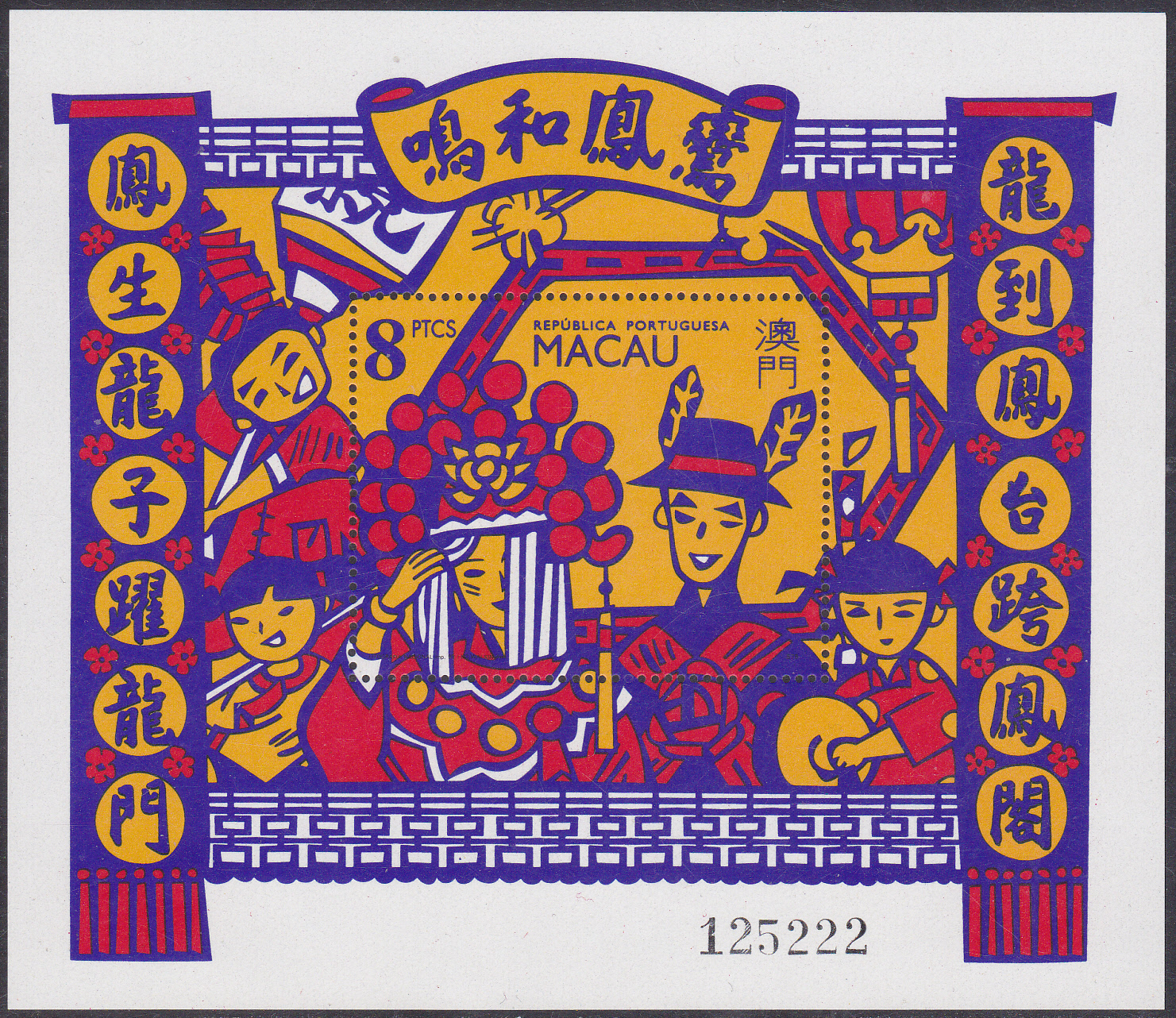Diese vier Marken wurden zusammenhängend gedruckt und ergeben zusammen eine komplette Hochzeitsfeier. Hier ein Zusammendruck vom oberen Bogenrand: