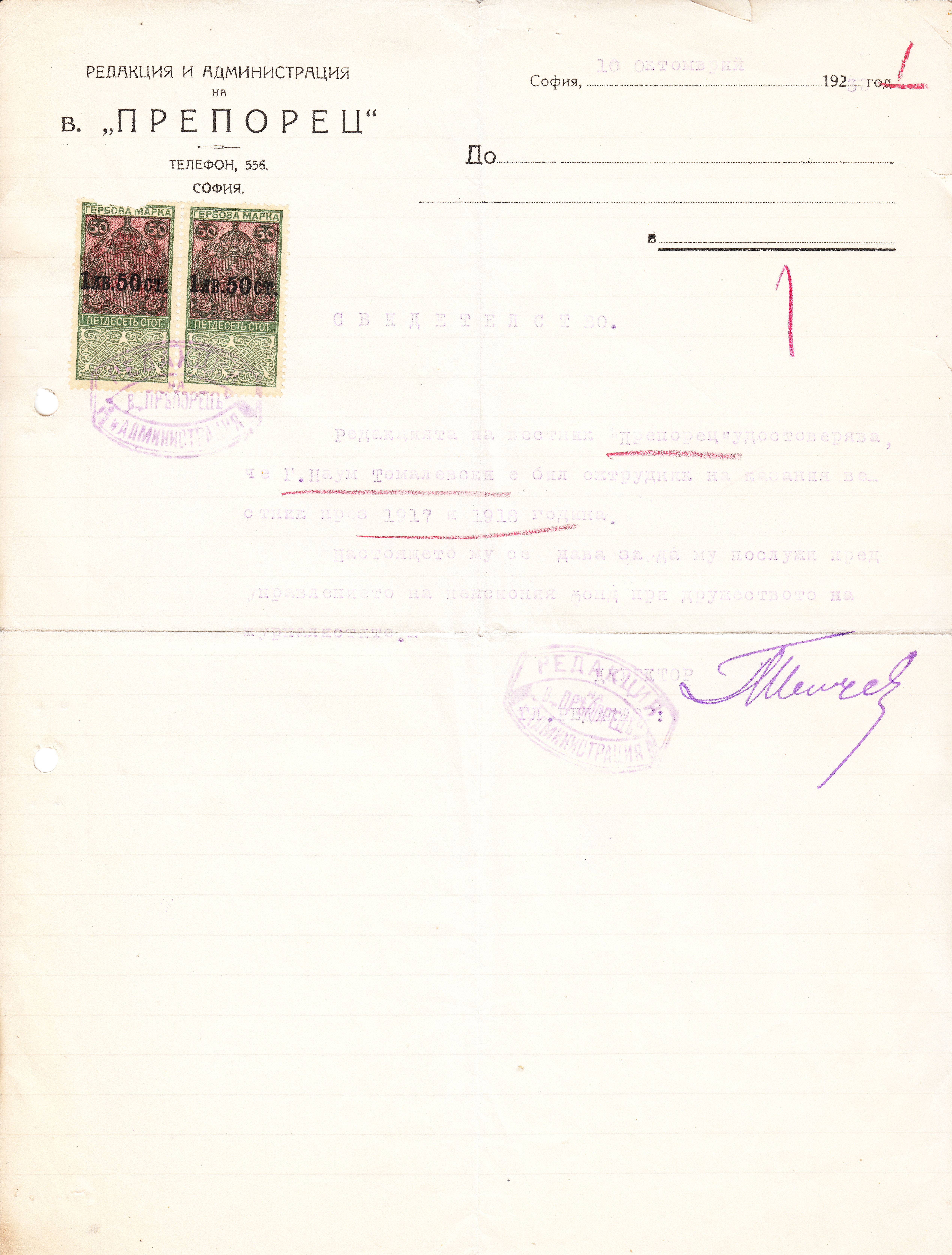 Dieses Dokument vom 10.10.1923 trägt ein Paar der 1918 mit einem Aufdruck "1 Lewa 50 Stotinki" versehenen Ausgabe der Wertstufe zu 50 Stotinki, katalogisiert als Barefoot Nummer 105: