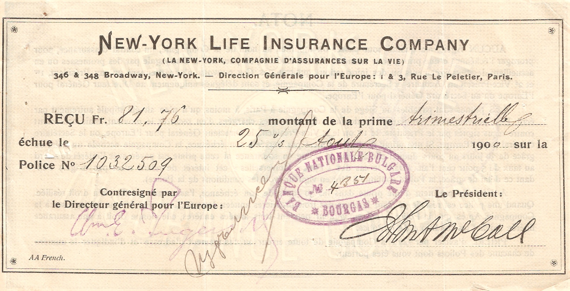 Es handelt sich um die "New York Life Insurance Company", also eine Lebensversicherungsgesellschaft deren Hauptsitz für Europa sich damals in Paris befand.