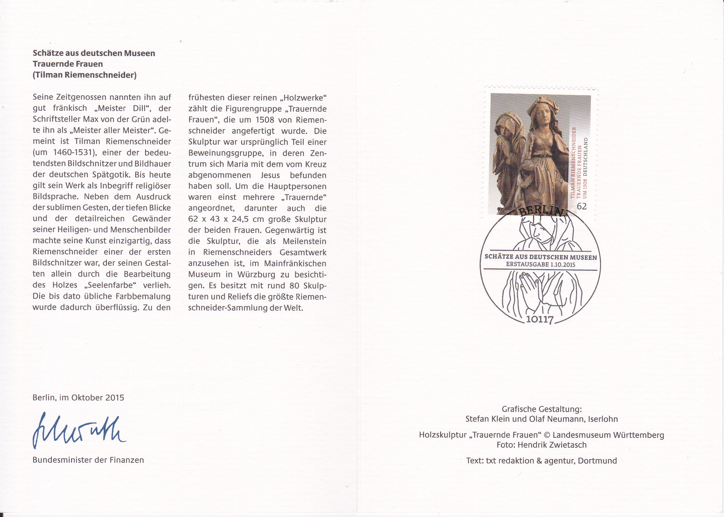 Ministerkarte des Finanzminister mit der Marke "Schätze aus deutschen Museen" (MiNr 3180) mit der Holzskulptur "Trauernde Frauen" und dem Ersttagsonderstempel Berlin.